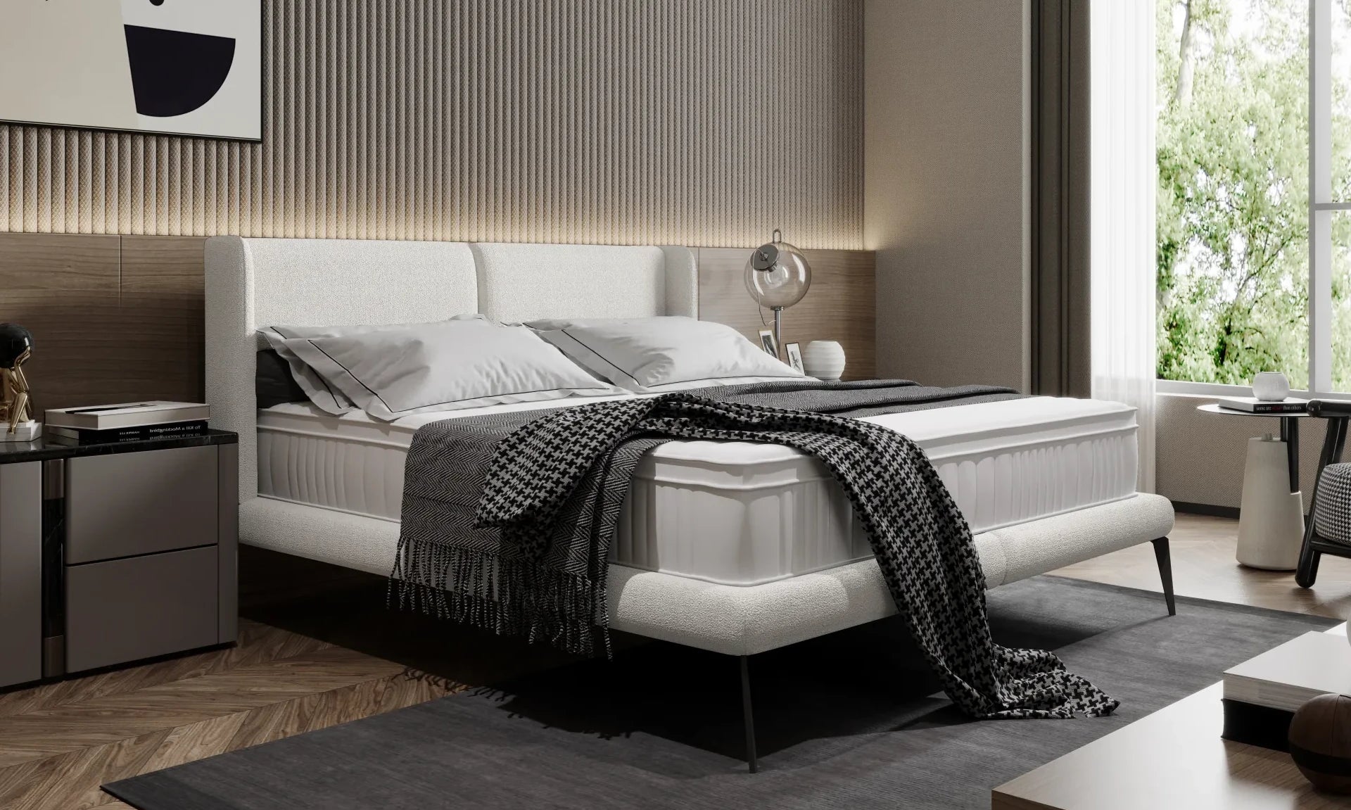 Tai klasikinė lova, kurios dizainas sužavės kiekvieną. Joje yra aukštas, minkštas galvūgalis su užapvalintais šonais. Tessina neabejotinai patrauks dėmesį ir taps bet kurio miegamojo puošmena. Lovos konstrukcija - tvirta ir ilgaamžė, o aukštos juodos kojos suteikia lovai lengvumo.