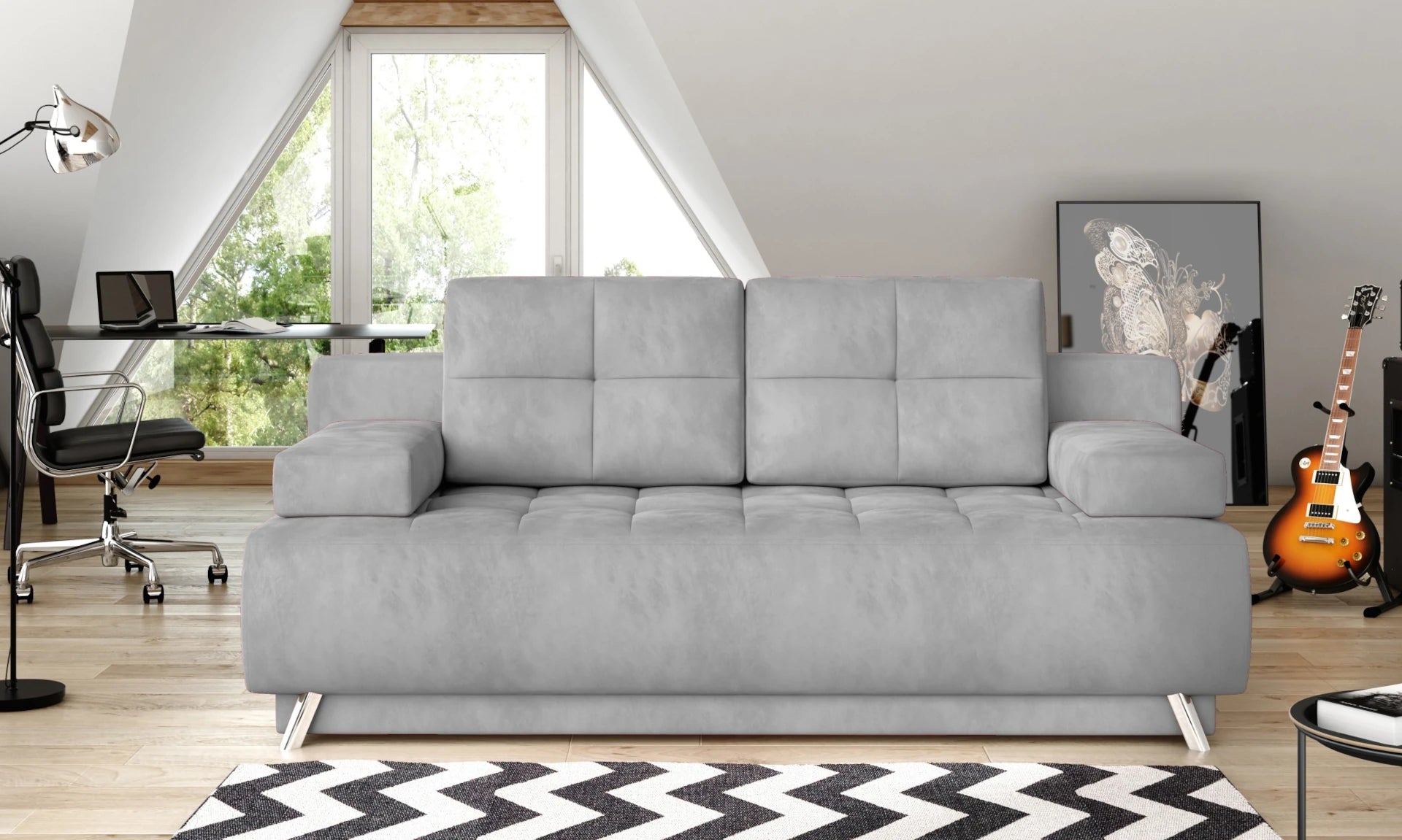 Oslo - kompaktiška, patogi ir modernaus dizaino sofa-lova su lengvai naudojamu automatiniu „delfino“ išskleidimo mechanizmu. Sėdimojoje ir atlošo dalyse naudojamos bonell tipo spyruoklės užtikrina didesnį komfortą tiek dienos poilsiui, tiek naktiniam miegui. Papildomas privalumas – galimybė pasirinkti audinio tekstūrą ir spalvą iš gausios raštų paletės, todėl sofa įgauna unikalų stilių, pritaikytą individualiam skoniui.