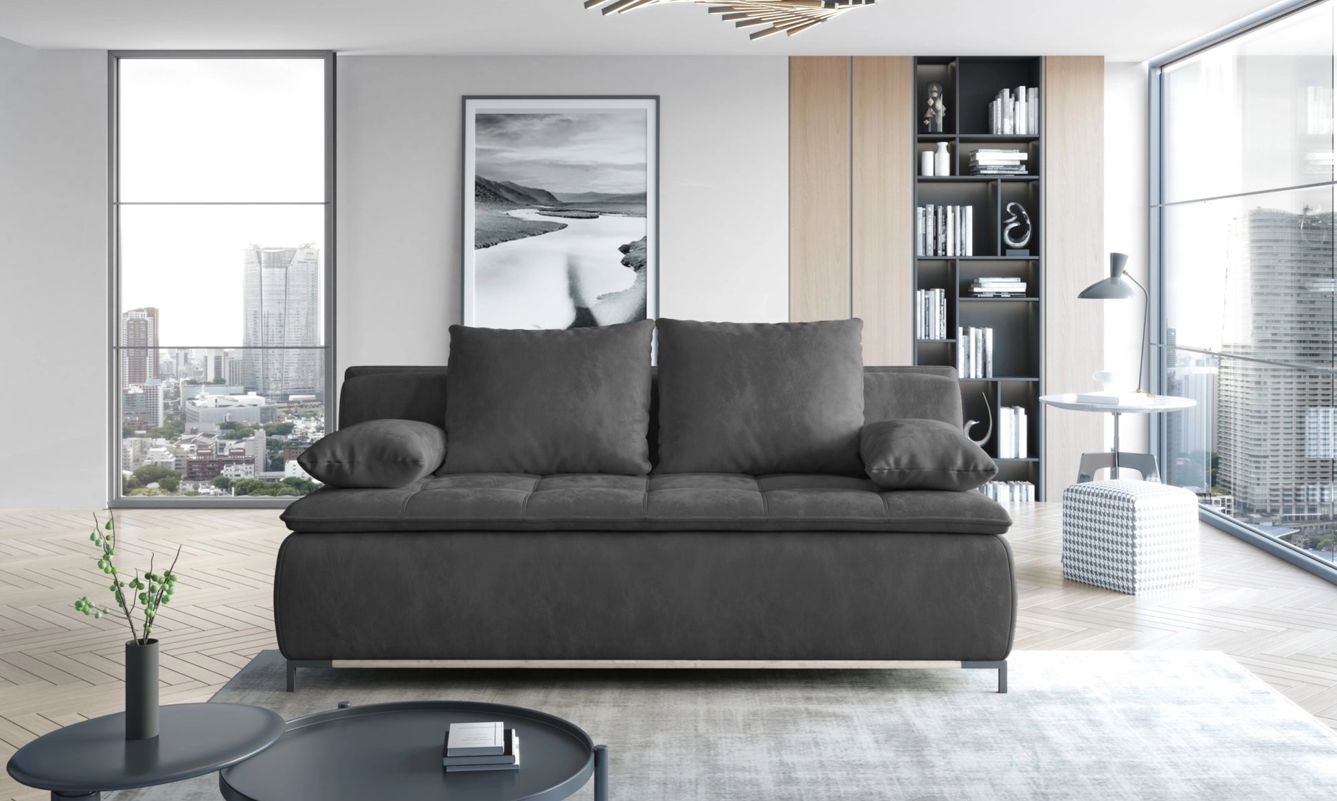 Metalo kojelių ir subtilios medinės juostelės derinys sukuria originalų dekoratyvinį akcentą. Sofa turi didelę patalynės dėžę, kurioje patogiai laikysite patalynę ar kitus daiktus. Sėdimojoje ir atlošo dalyse naudojamos bonell tipo spyruoklės užtikrina didesnį komfortą tiek dieną, tiek naktį. Papildomas privalumas – galimybė pasirinkti audinio tekstūrą ir spalvą iš plačios raštų paletės, todėl sofa įgauna unikalų stilių, pritaikytą individualiam skoniui.